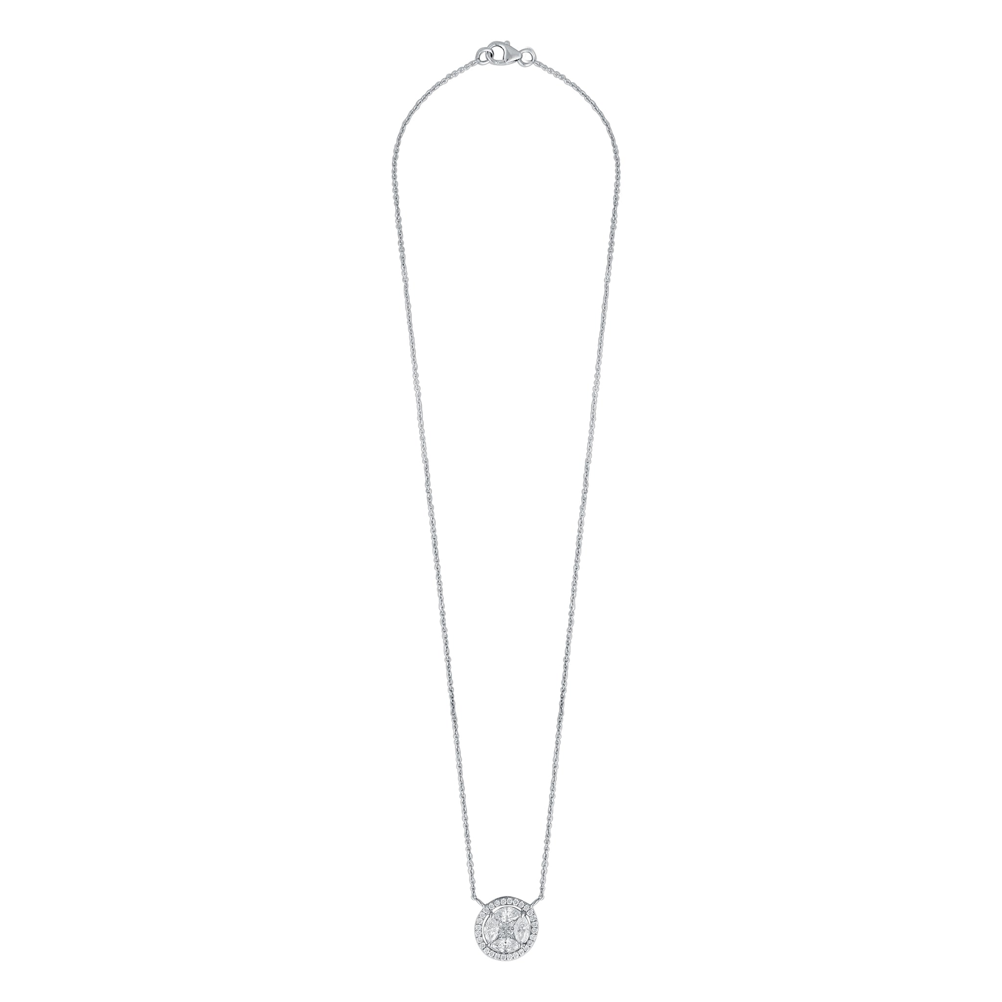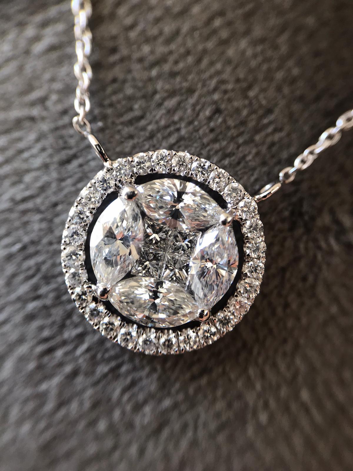 Made in 18K white gold, weighing 3.78 grams, this necklace has a round-shaped centre-piece set with princess- and marquise-cut diamonds, surrounded by a diamond jacket. Diamonds weigh 1.59 carats and are of F-G colour and VS-SI clarity.