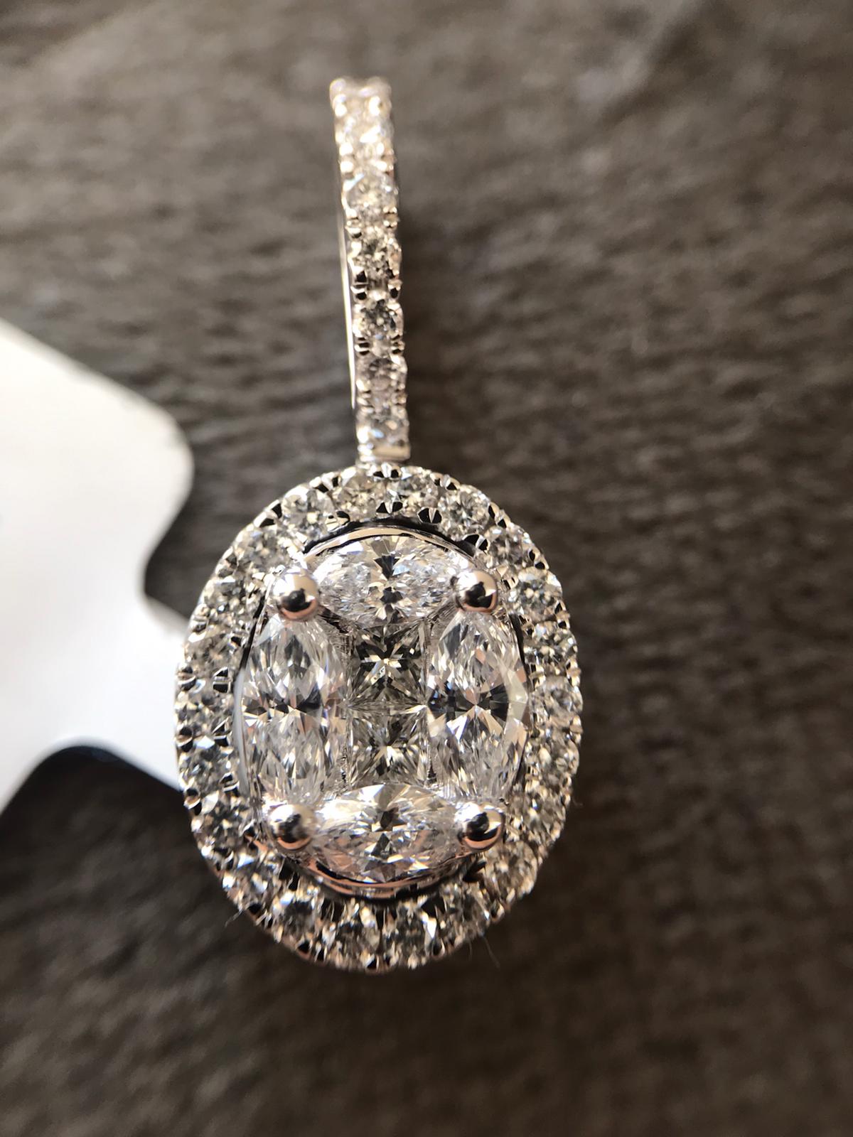 This oval-shaped pendant weighs 1.98 grams and has a diamond studded loop. This is made in 18K white gold with 36 natural diamonds weighing 0.86 carats of F-G colour and VS-SI clarity, cut into round, princess and marquise shapes.