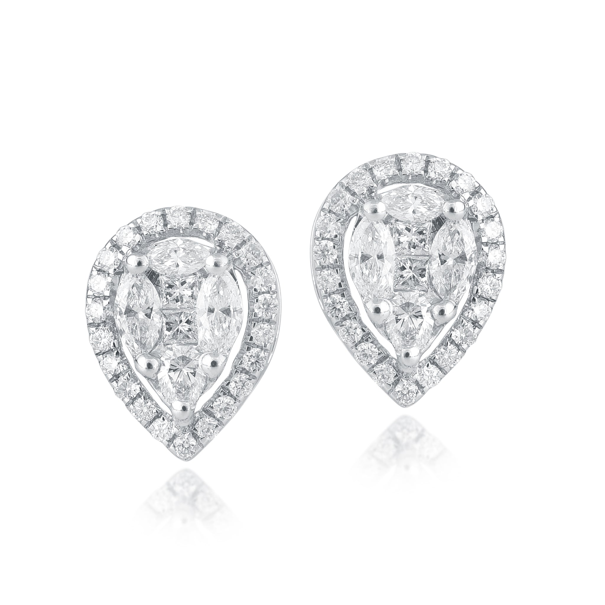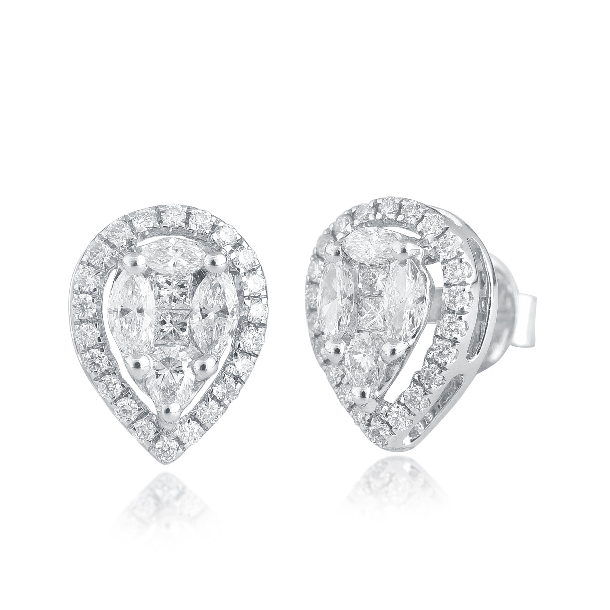 Made in 18K white gold and weighing 3.40 grams, these pear-shaped earrings with a diamond-studded jacket have 56 natural diamonds cut into - round, princess, marquise and pear shapes - weighing 0.89 carat of F-G colour and VS-SI clarity.