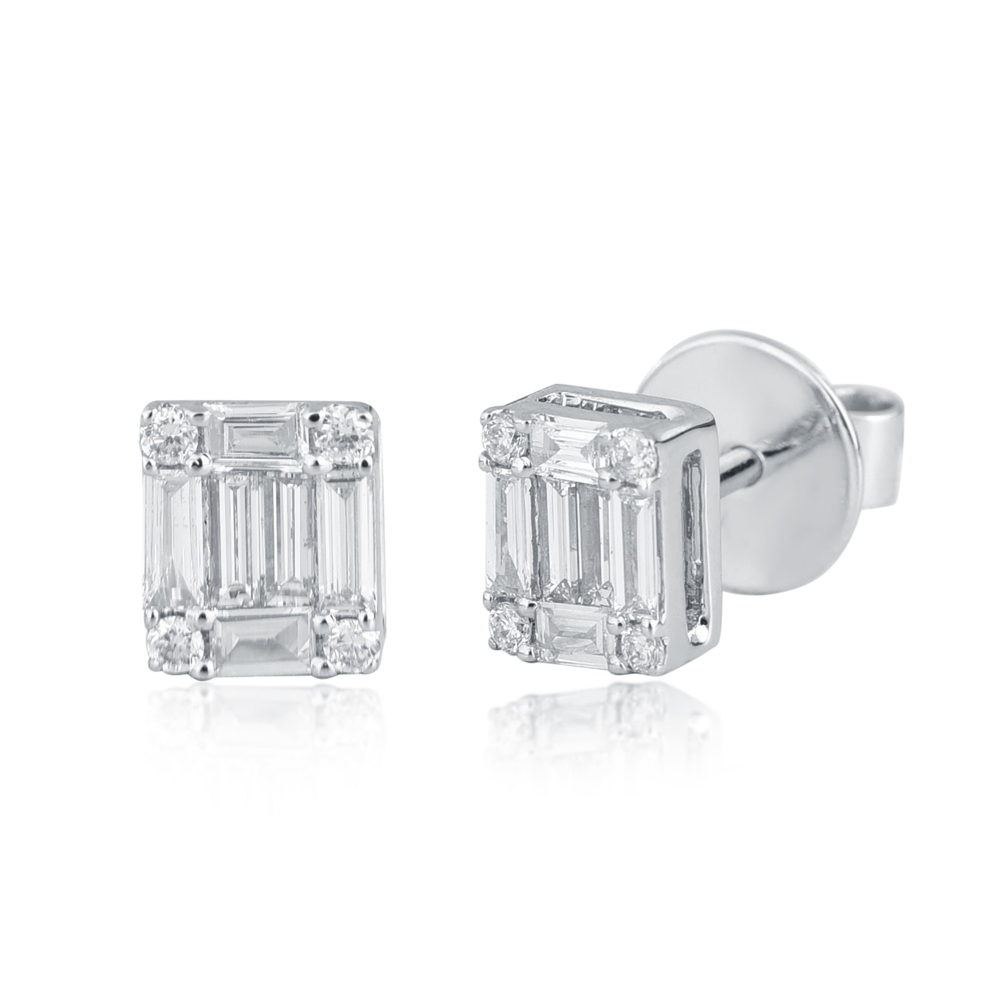 Twenty-nine round and baguette shaped natural diamonds are set elegantly in a square block in 18K white gold earrings weighing 1.85 grams. The diamonds weigh 0.38 carat, are of F-G colour and VS-SI clarity.