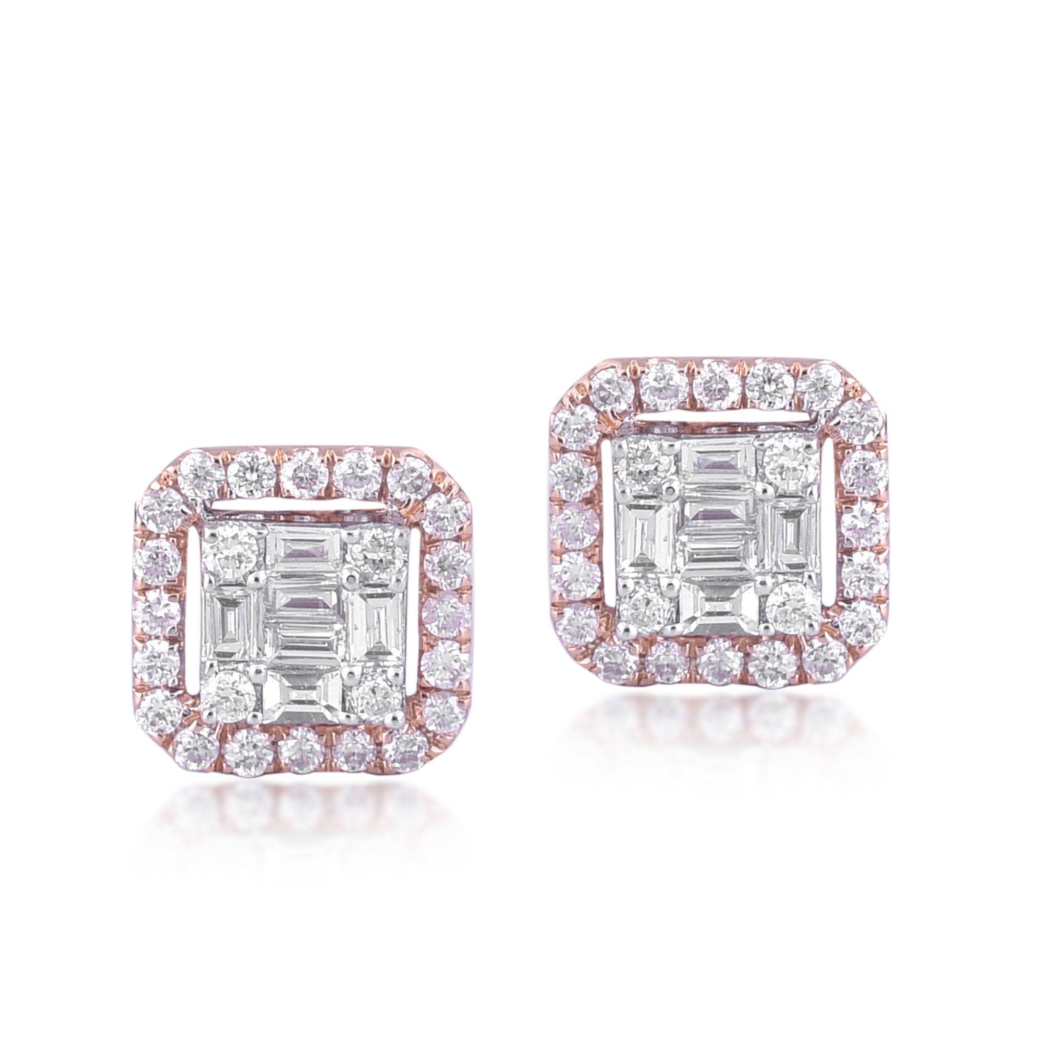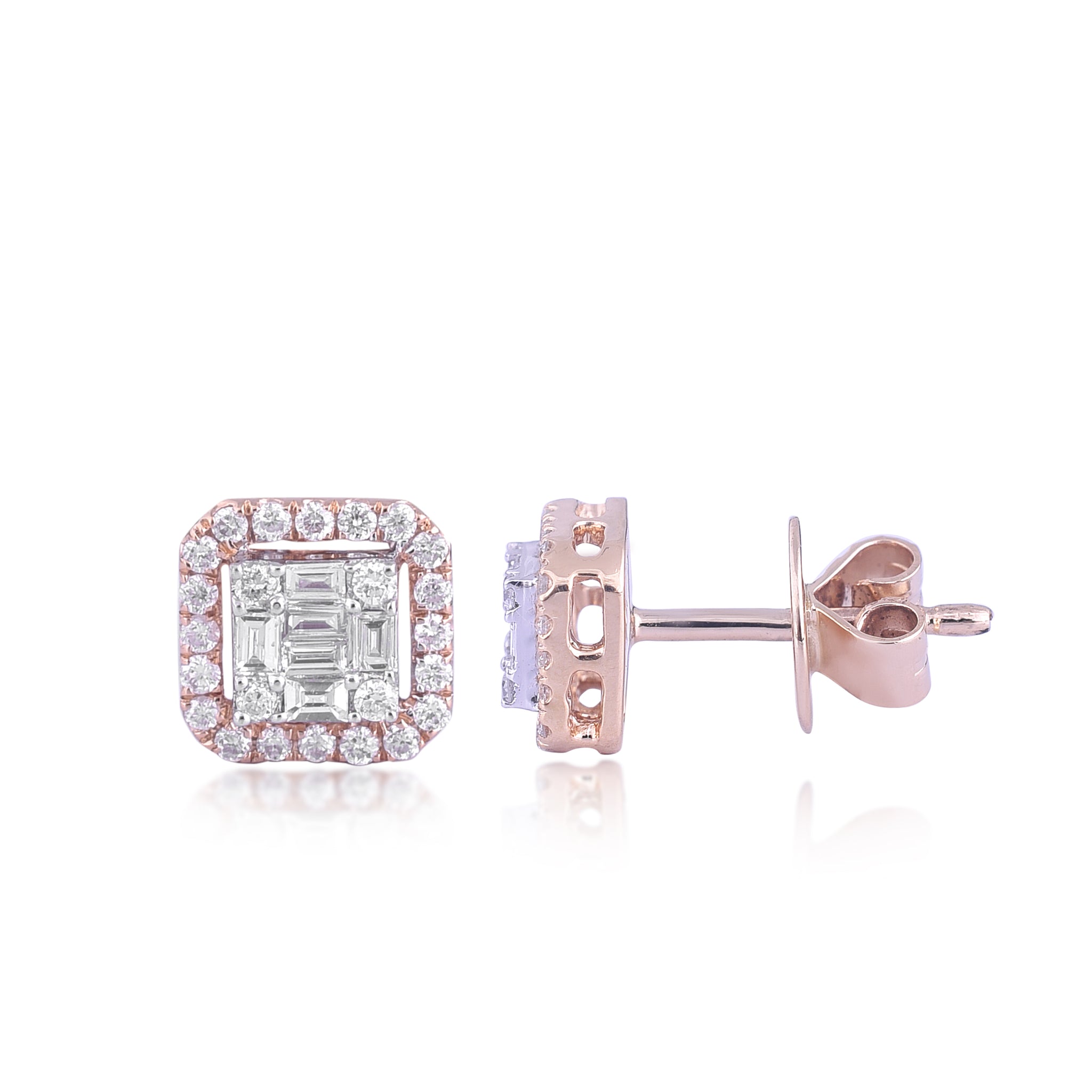 Made in 18K yellow gold and weighing 2.33 grams, these square studs with a diamond studded jacket contain 60 natural diamonds - round and baguette cut - weighing 0.31 carat, of F-G colour and VS-SI clarity.