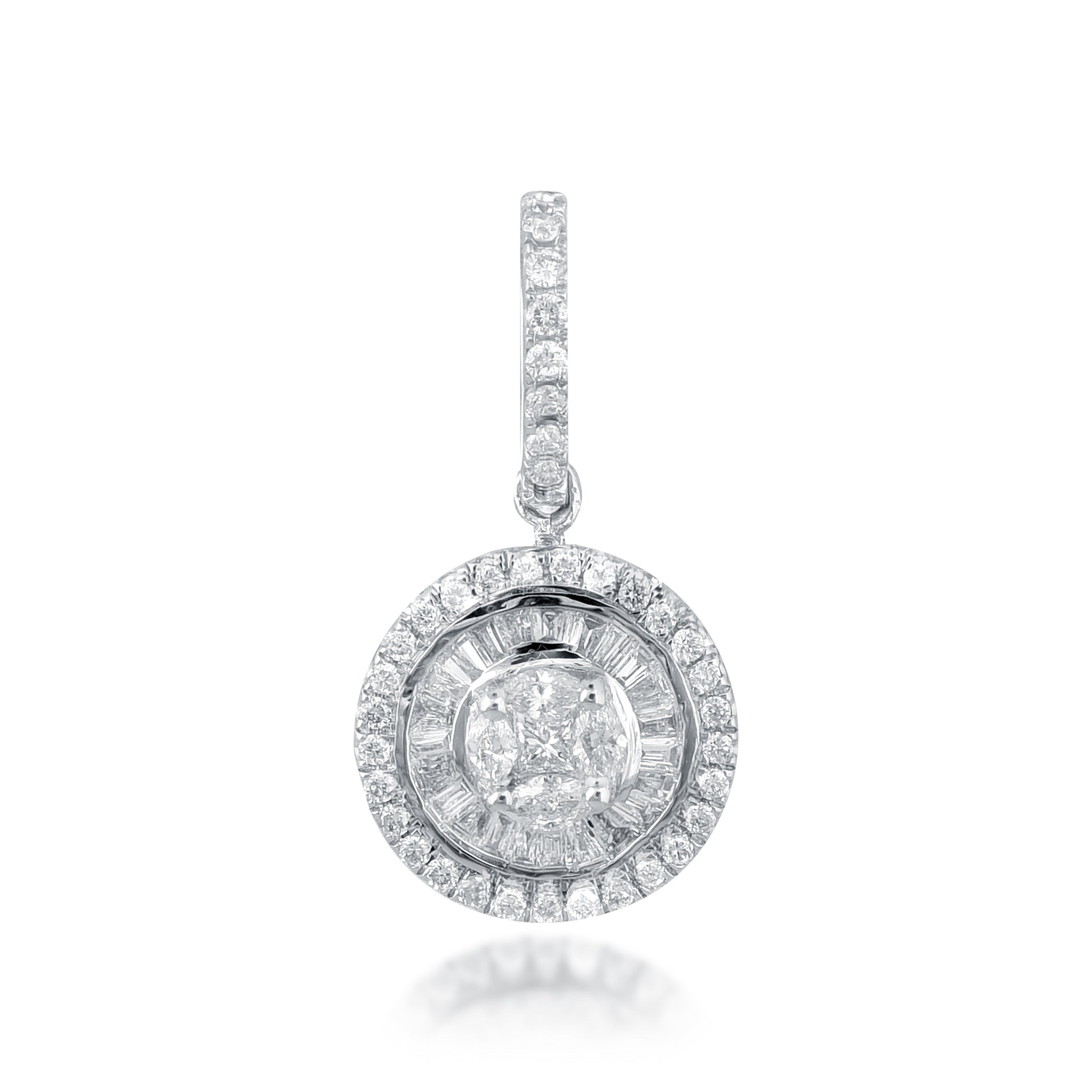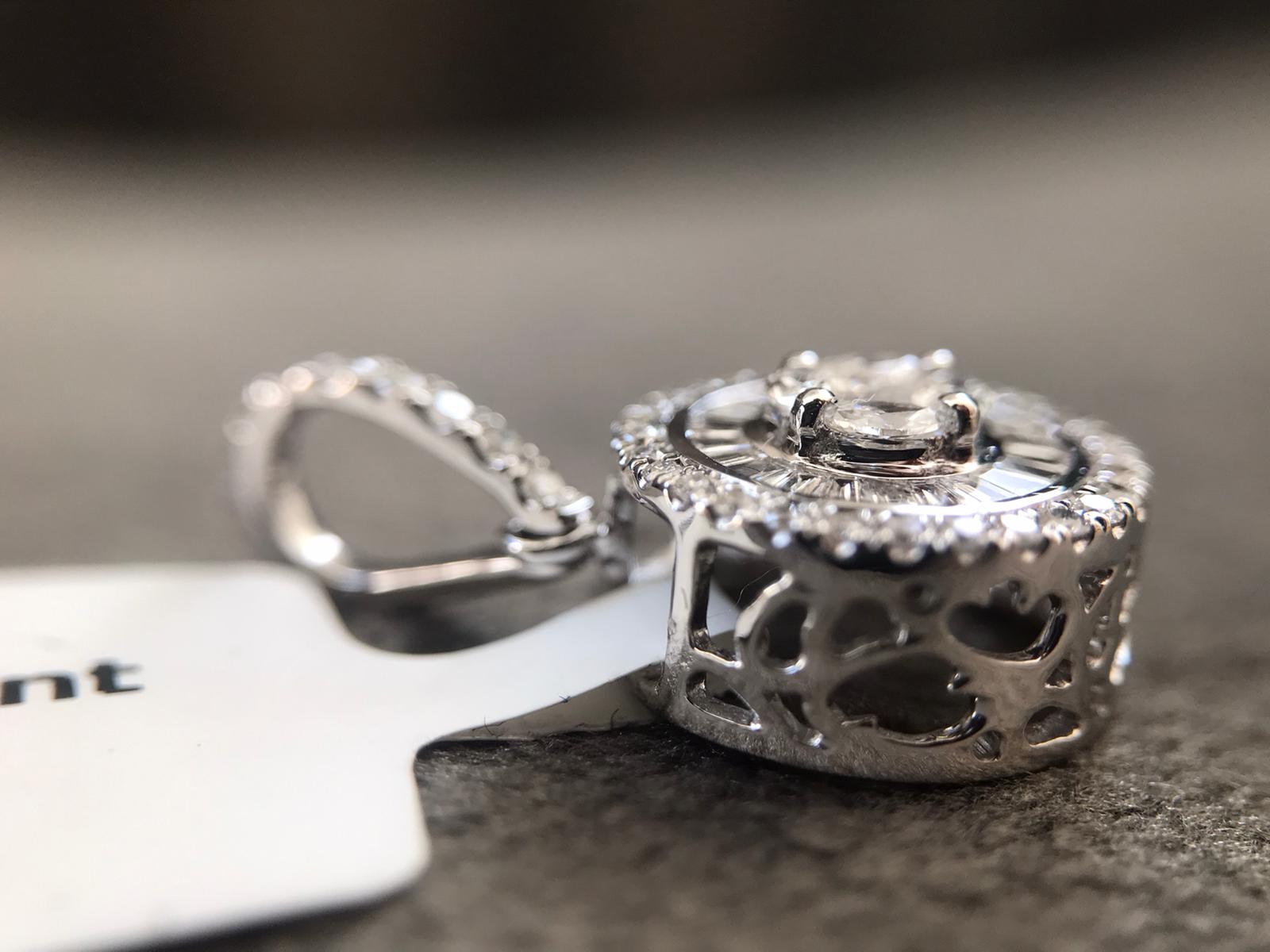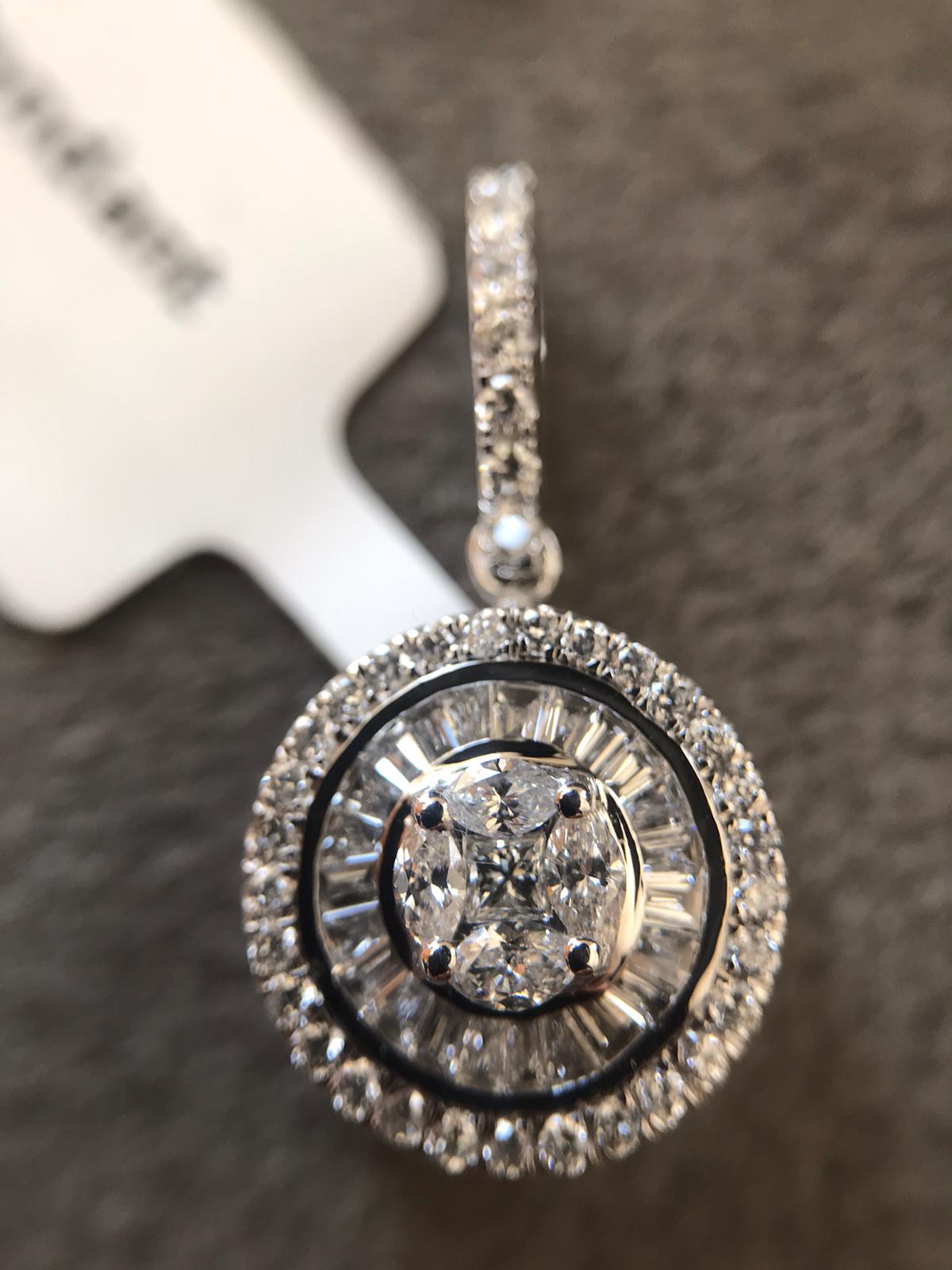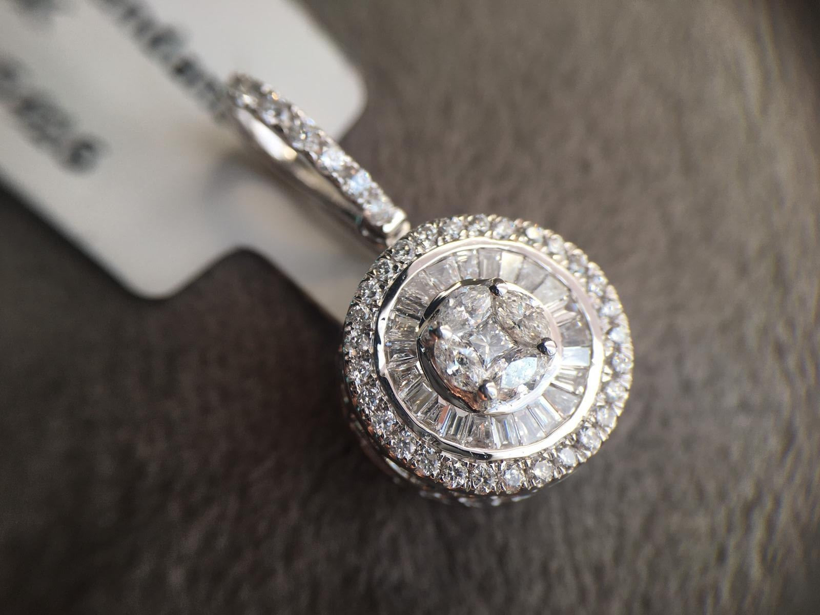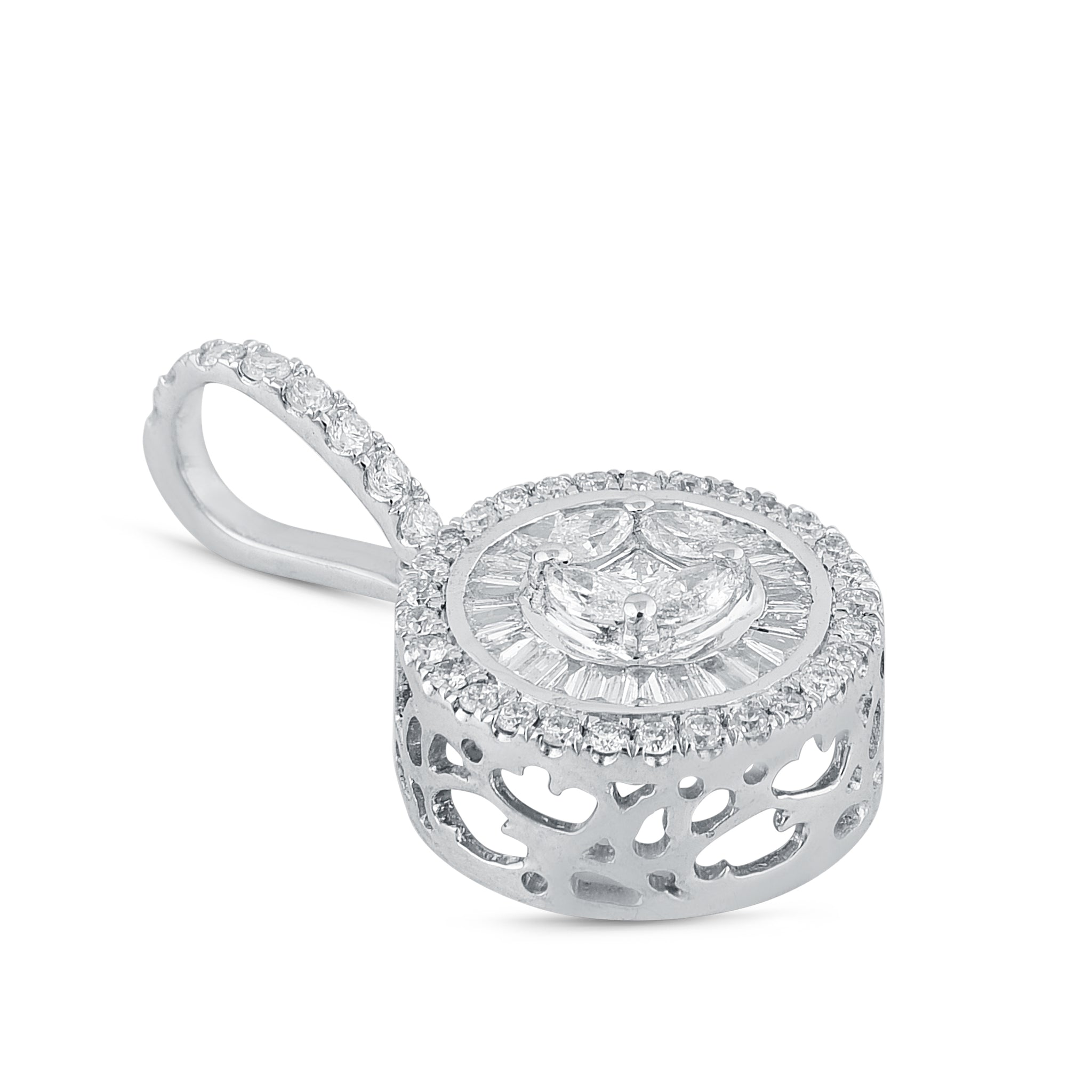 18K white gold pendant weighs 1.88 grams and has 65 natural diamonds, weighing 0.44 carat, cut into four shapes - round, princess, baguette and marquise - and set in a round-cluster centre for the perfect shimmer. The cluster has a diamond-studded jacket and a diamond-studded loop.