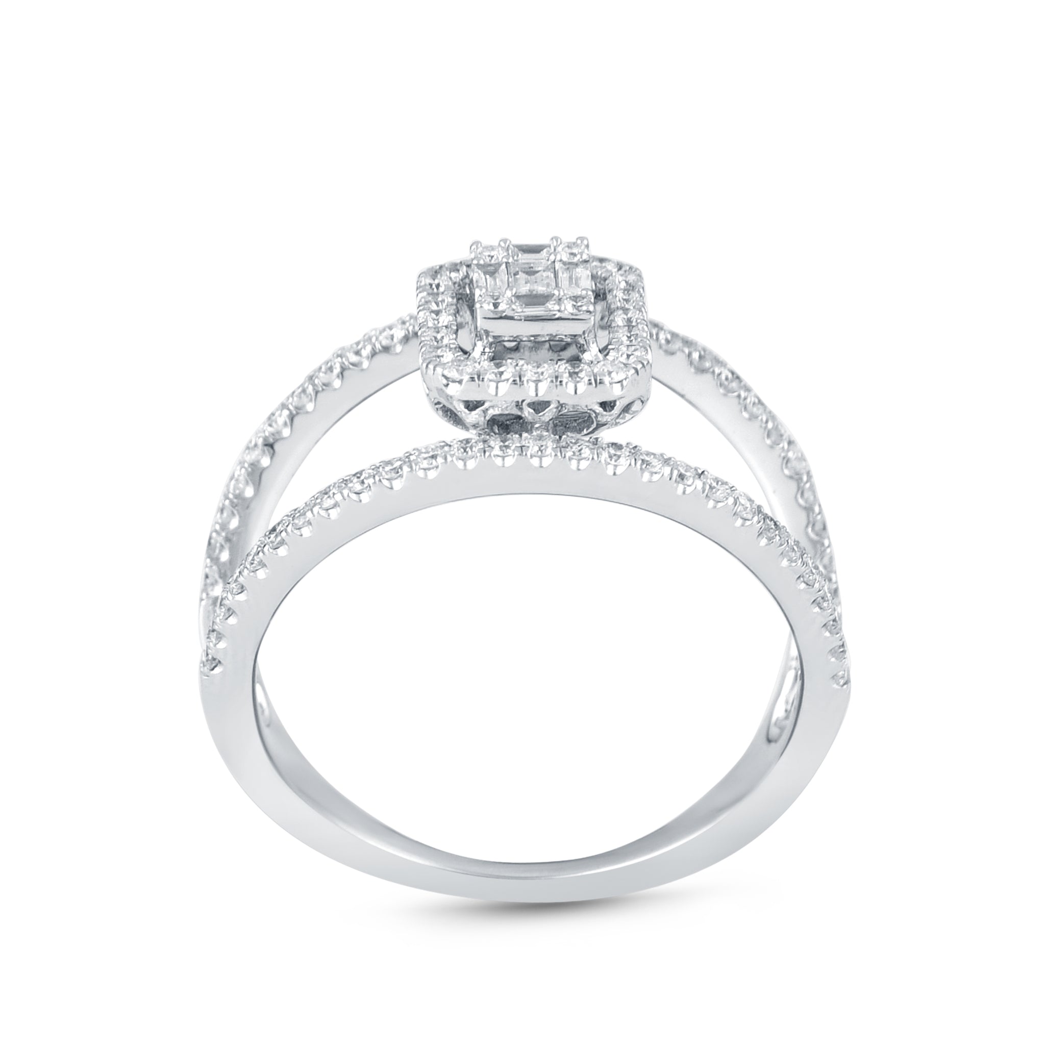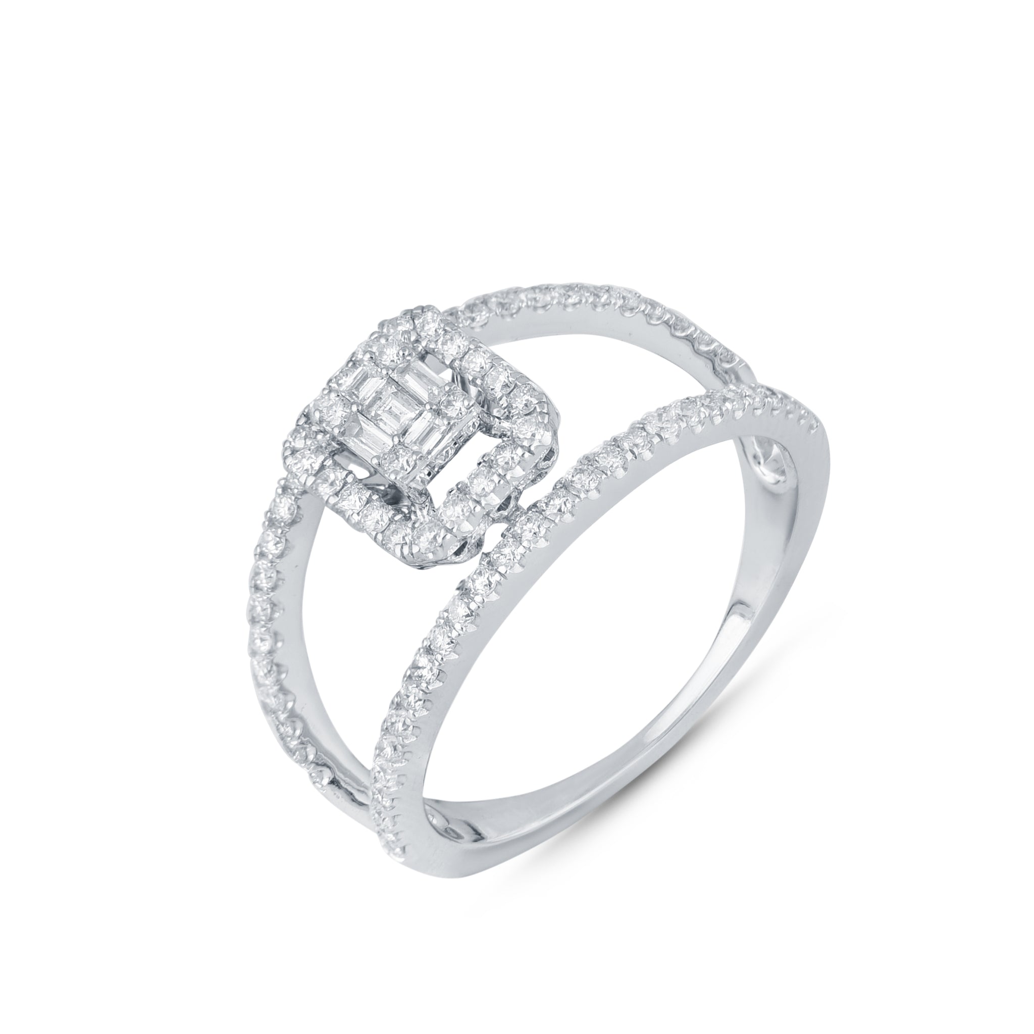 Two circular discs come together to form this elegant ring weighing 3.31 grams. The round brilliant- and baguette-cut 83 natural diamonds in this ring of F-G colour and VS-SI clarity, weigh 0.55 carat.